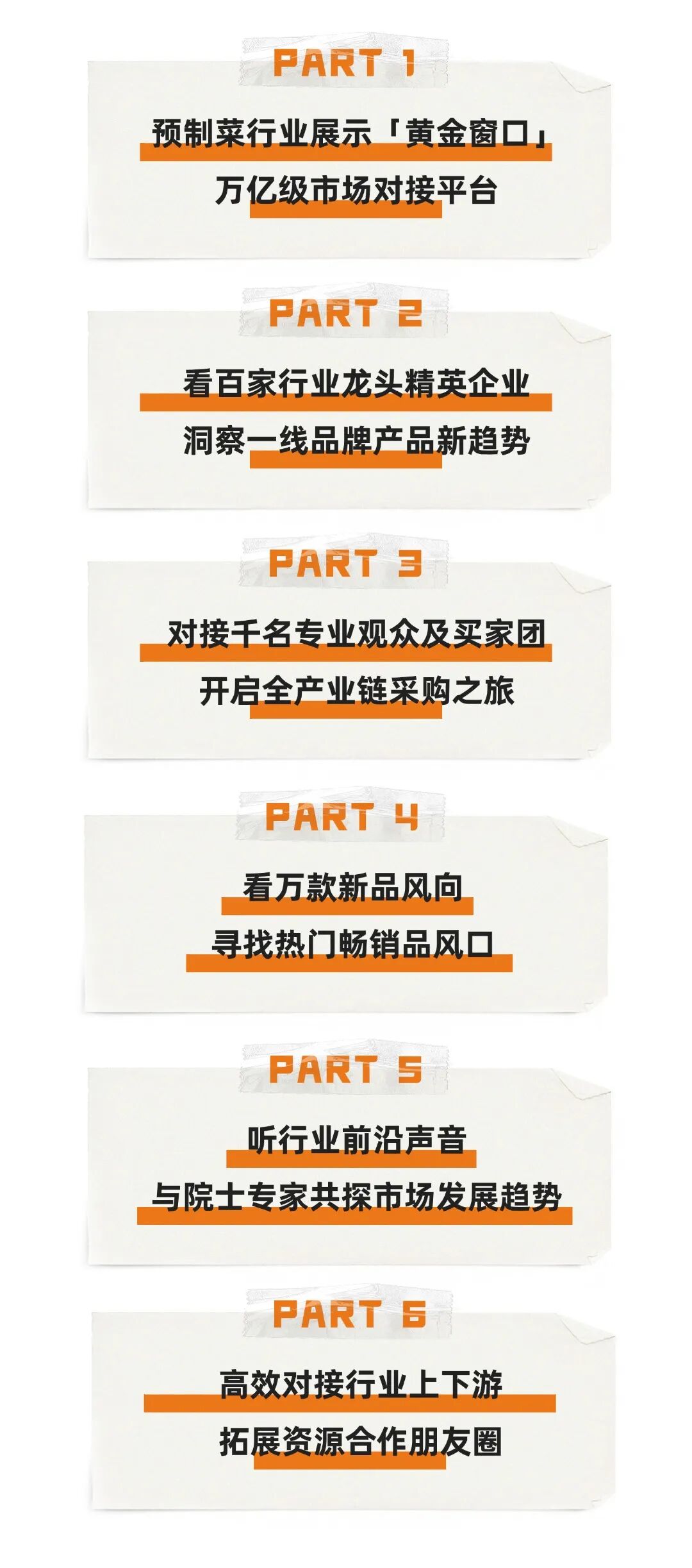 本届展会展览总面积30000平方米,现场将汇聚千款优质单品,涵盖预制菜半成品、预制菜成品、综合预制菜、预制菜调料、食品生产设备、智能加工设备、包装设计、冷链物流等领域。届时将有超10万国内外优秀展商、专业买家和观众齐聚佛山,共襄行业盛举。
