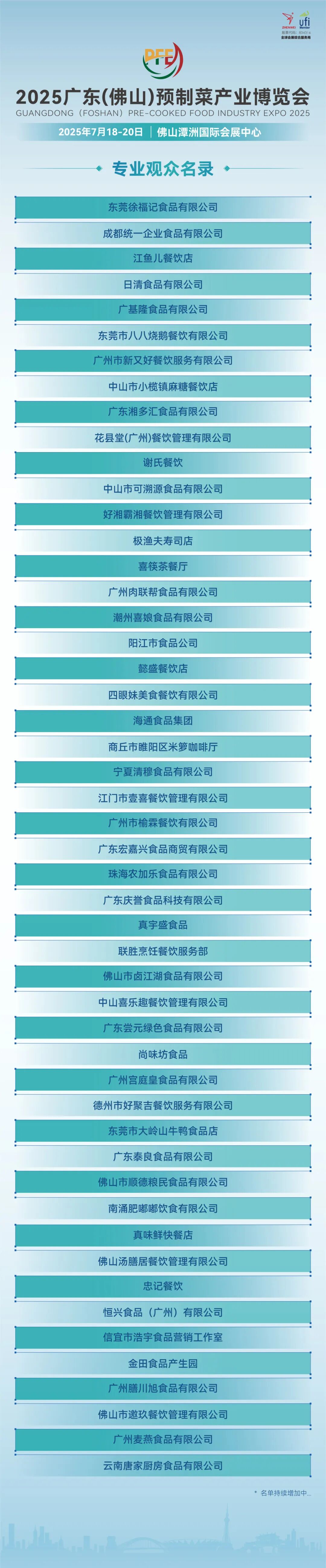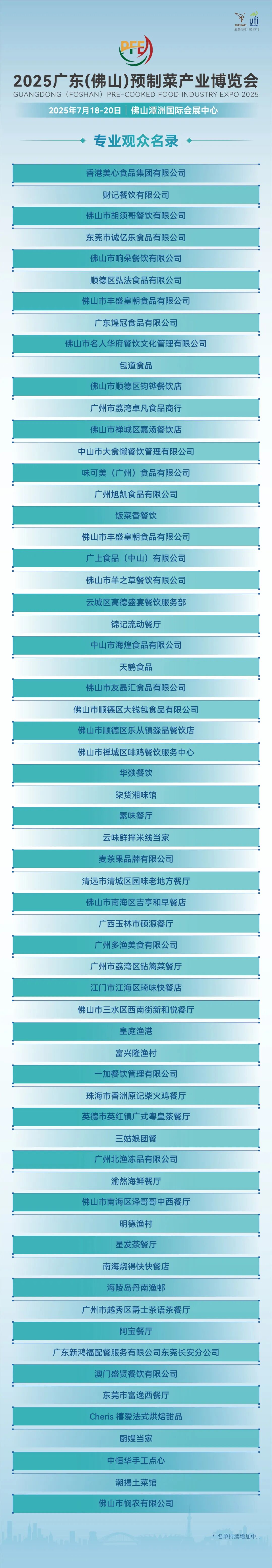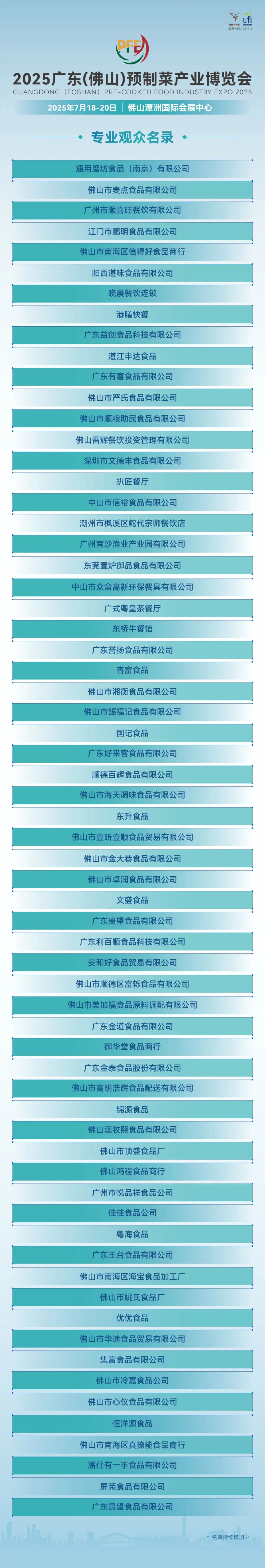 往届展会上,安井食品、味知香、国联水产、新雨润、统壹、何氏水产、逮虾记、粤香食品、袁记食品、懿嘉食品等水产类、肉类、调味料类头部企业及知名企业纷纷亮相。截止目前,已有行业龙头企业、预制菜百强品牌企业、预制菜原材料、调味品企业、食品机械设备、包装设计、冷链物流等超过100+企业确认参展2025佛山预制菜展,7月盛夏将携新品新技术亮相佛山潭洲国际会展中心!